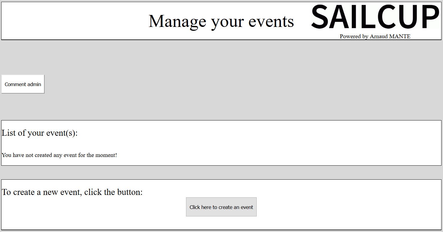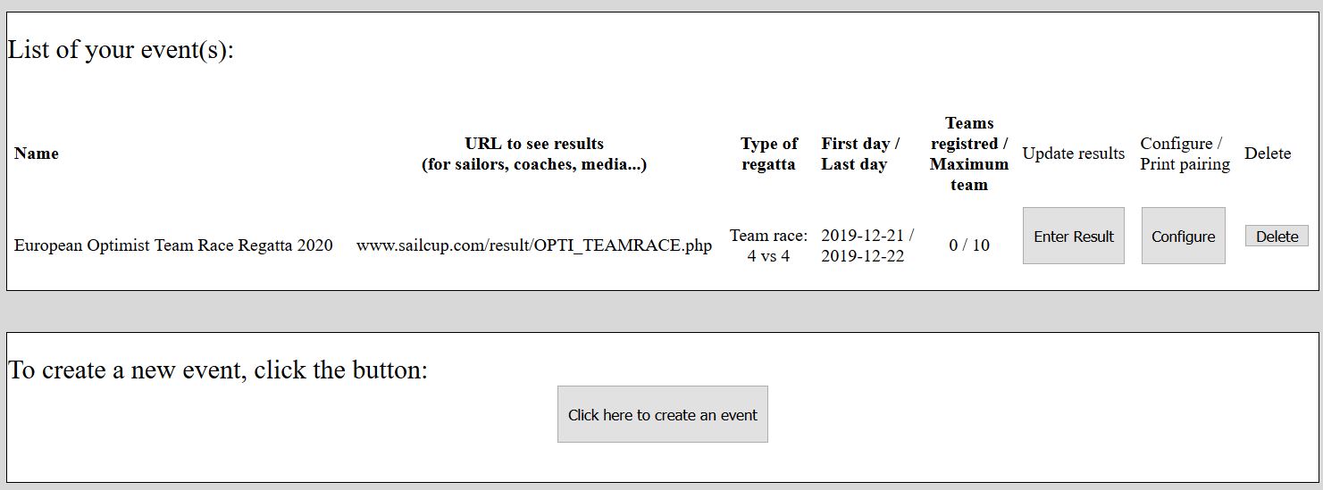 Congratulations your event is now created, you can see it in the list. You should receive soon an email to confirm the creation. In this email, you will receive also the URL / web-address to give to the sailors, coaches...