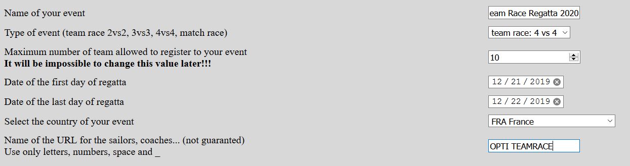 Name of your event: Just give the full name of your event. For exemple, it can be "European Optimist Team Race Regatta 2020". This event will be a team race event 4 vs 4 with a maximum of 10 teams.