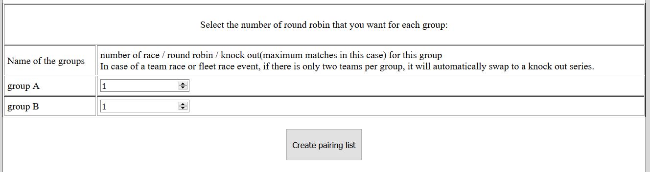 Here, you will choose how many round robins you want for each group. Of course, you can have two round robins for group A and three round robins for group B. It will be the case for the knock out for example, when you want to have the petite final best of 3 matches (3 round robins) and the final best of 5 matches (5 round robins). But here, just leave one round robin for each group, and click the button 'Create pairing list'.