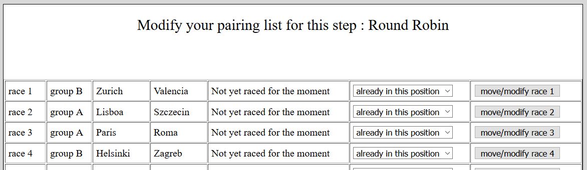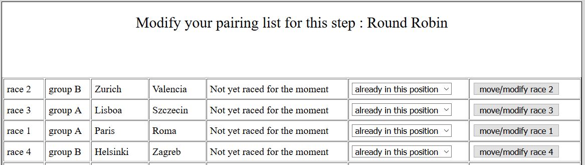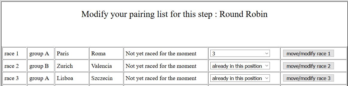 Universal pairing: this is the pairing list with all matches. On the pairing list you will have the sequence of the matches, the teams involved in this match, eventually the group of this match (group A or group B, on the future can be GOLD group or SILVER group), and also the racing area (if you have chosen only one group with two racing areas: explained in other page). This pairing will be mainly for the race committee, the umpires, the media…